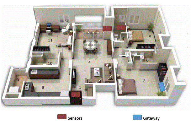 Sensors at key points in the home transmit data wirelessly to the gateway and on to the Internet. If an unexpected changes in normal routine is detected then the cloud monitor sends alerts to caregivers. False alarms are avoided by several stages of checking..